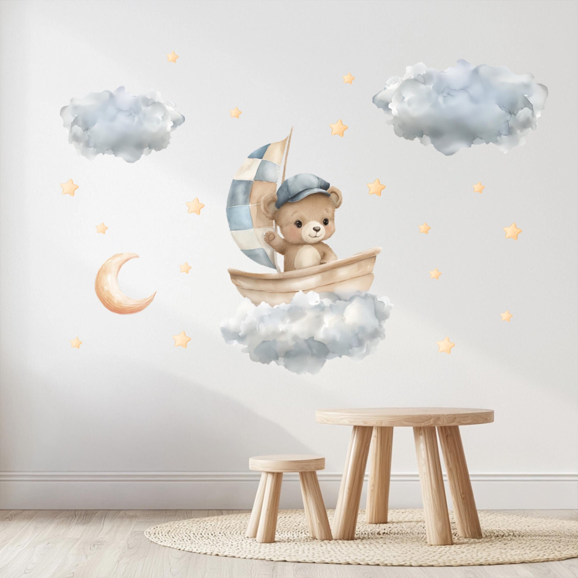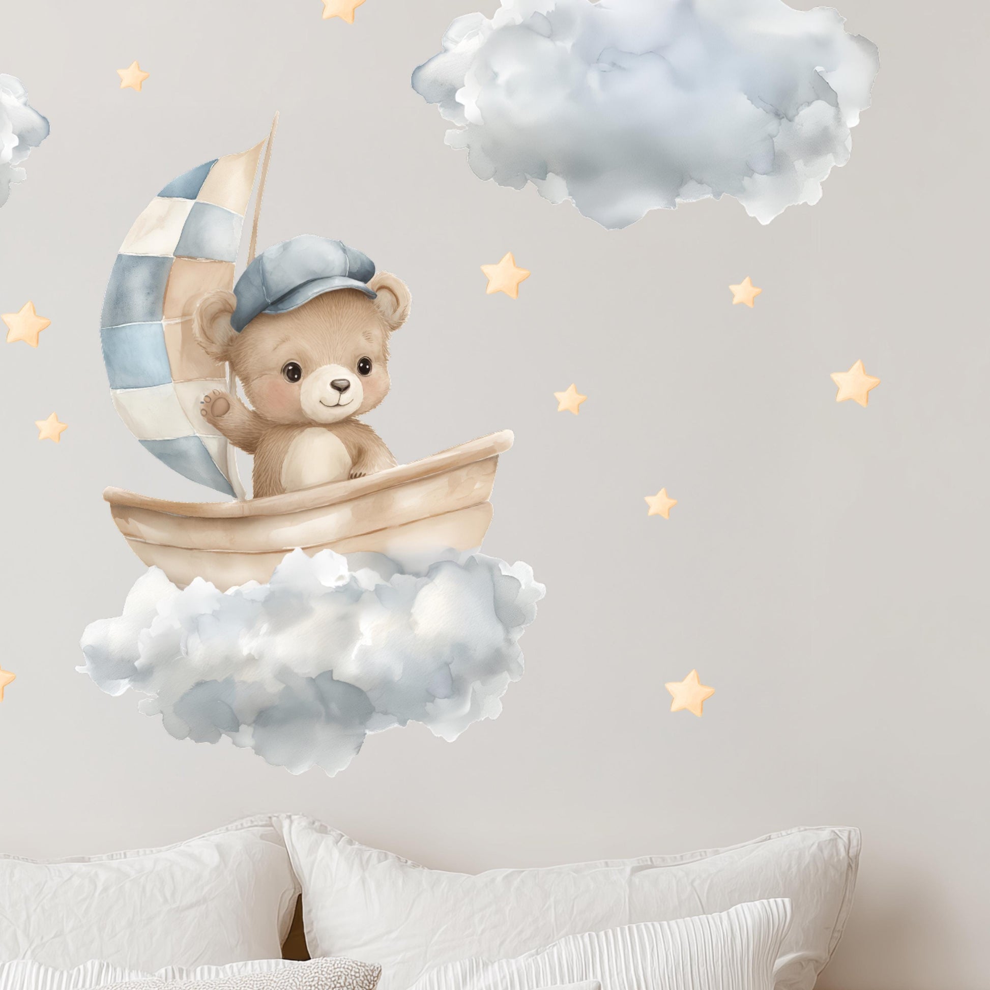 Bear in Boat Wall Decals – Watercolor Nursery Stickers with Clouds, Stars & Moon, Removable and Non-Toxic Baby Room Decor